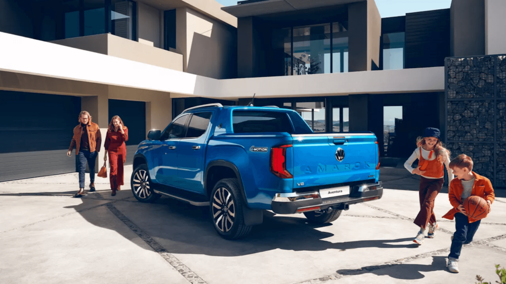 The Volkswagen Amarok boasts a commanding presence with its rugged yet sophisticated design. The front end features a striking radiator grille flanked by modern “IQ.Light” LED matrix headlights, providing excellent visibility and a distinctive look. Its robust stance is further accentuated by large alloy wheels, available in sizes up to 21 inches, and a high ground clearance that enhances off-road capability. The Amarok’s exterior is designed to impress and perform, making it a versatile choice for any terrain.